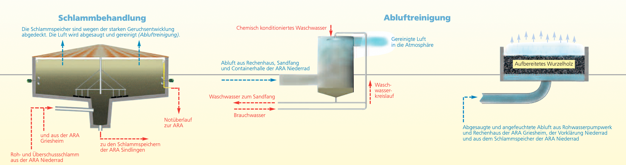 Die Abluft wird gezielt abgesaugt und gereinigt. Ebenso sind die Ersten Biologischen Stufen abgedeckt; als Schlammbehandlungsanlagen dienen geschlossene Behälter. Auch hier wird die Abluft abgesaugt.