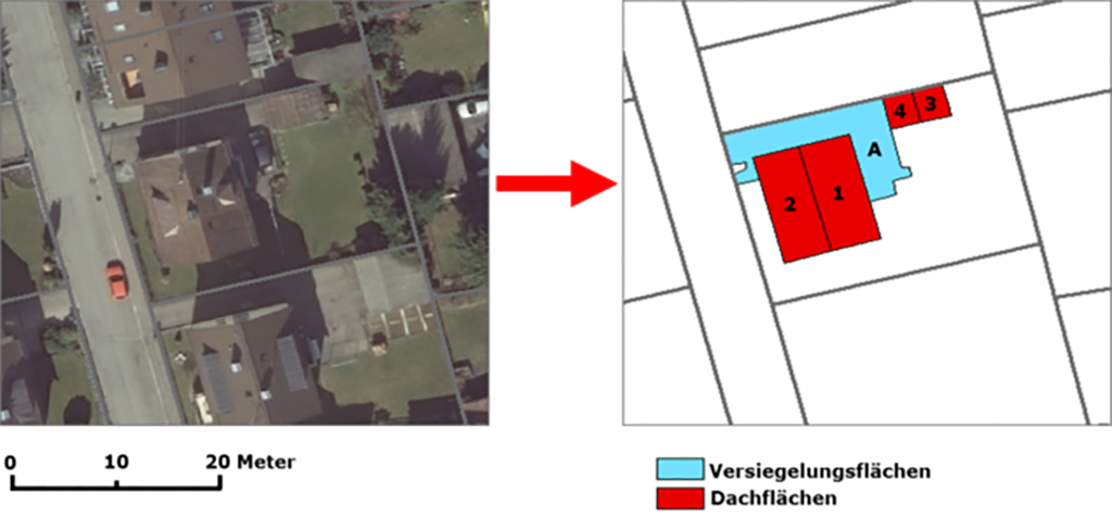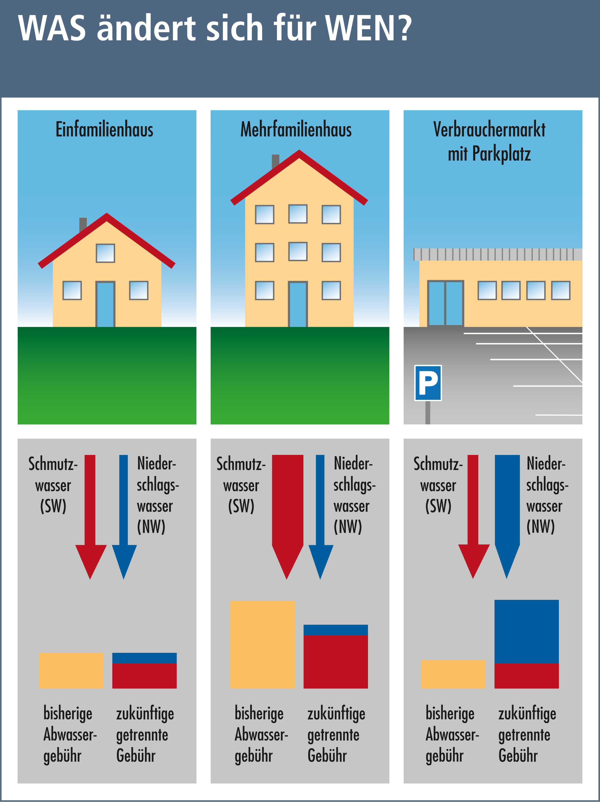 • von mehrgeschossigen Häusern, mit einem geringen Anteil an versiegelter Fläche die Abwassergebühren eher niedriger ausfallen als vor der Einführung der getrennten Gebühr (mittig im Bild).