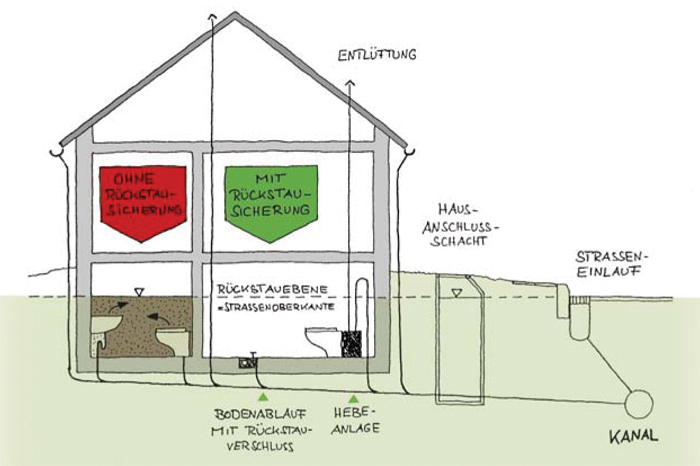 Diese maximale Rückstauebene ist maßgebend für die Sicherung aller Grundstücksentwässerungsanlagen. Bei Rückstau kann das Wasser des Kanals ansonsten aus den tiefer gelegenen Ablaufstellen wie Bodenabläufen, Waschbecken, WCs, Duschen, Waschmaschinenabläufen etc. austreten, falls diese nicht vorschriftsmäßig gesichert sind. Übrigens kann es auch ohne Niederschläge jederzeit zu Rückstau-Situationen kommen, zum Beispiel infolge Kanalverstopfung durch einen Fremdkörper, Rohrbruch oder Ausfall eines Pumpwerks, auch für Gebäude, die bis dahin nicht betroffen waren.